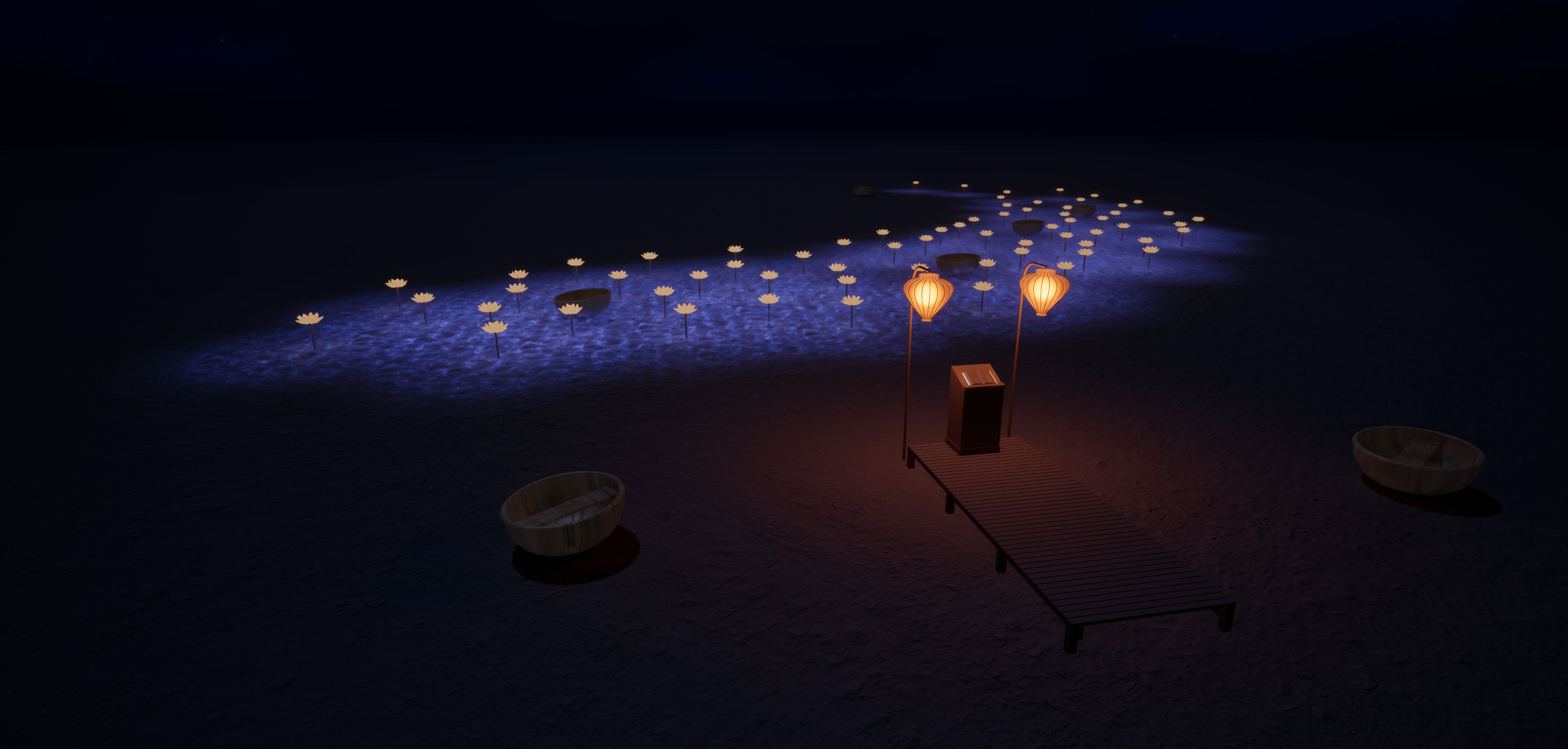 A dock marks the shore, where a bustling village soundscape and a poem in three languages set the threshold. Beyond, the boats scatter into the lantern field. Caustic light ripples across the playa like shallow water. The lanterns thicken, the sound softens, the shore fades.
