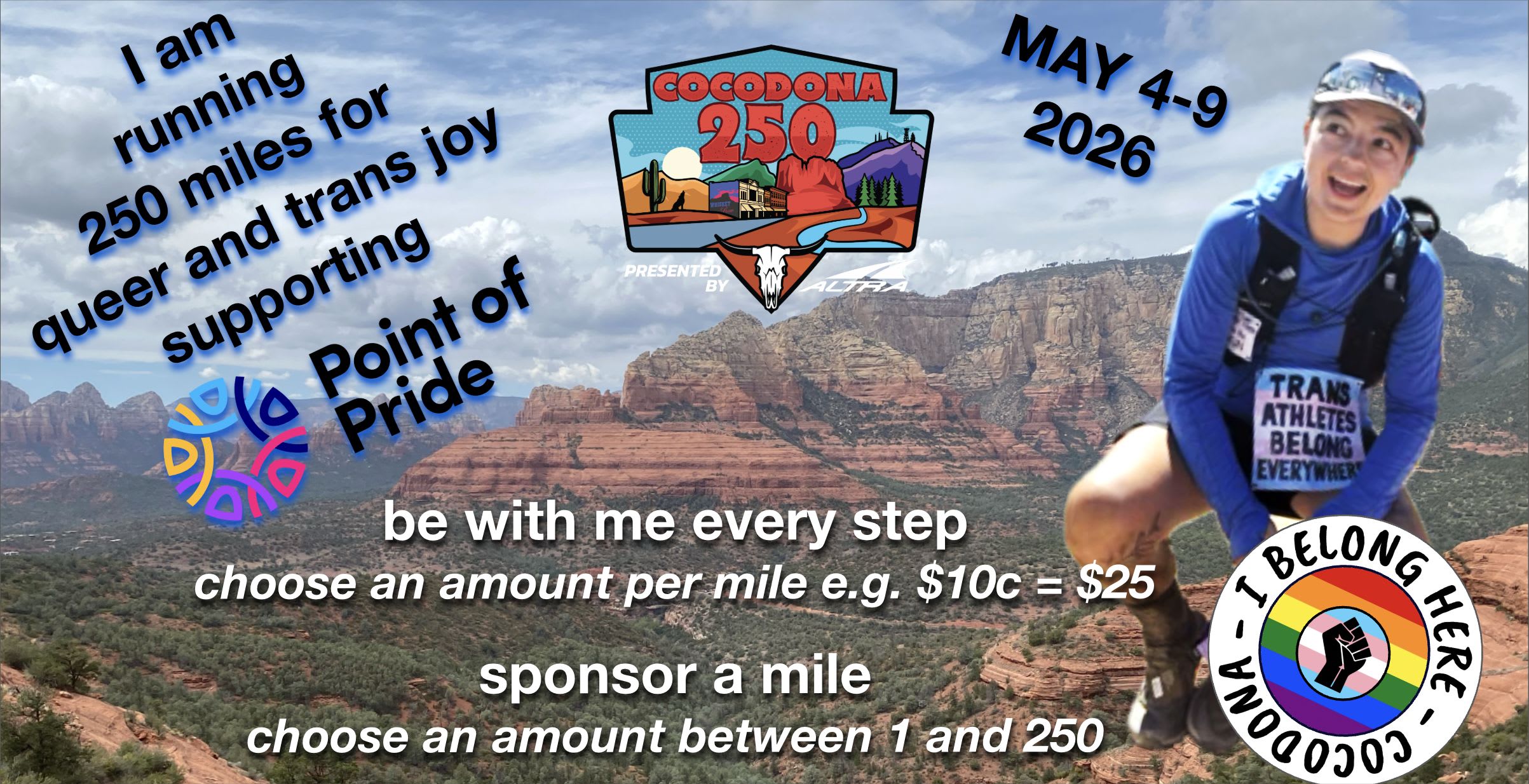 I am running 250 miles because queer and trans people deserve to feel safe, seen, and at home in their bodies and on the trails. I am raising funds for Point of Pride, which provides direct support for gender-affirming care. Every mile I run is in support of someone navigating a system that was not built for them. Your donation helps make that care possible. There are two ways to join me